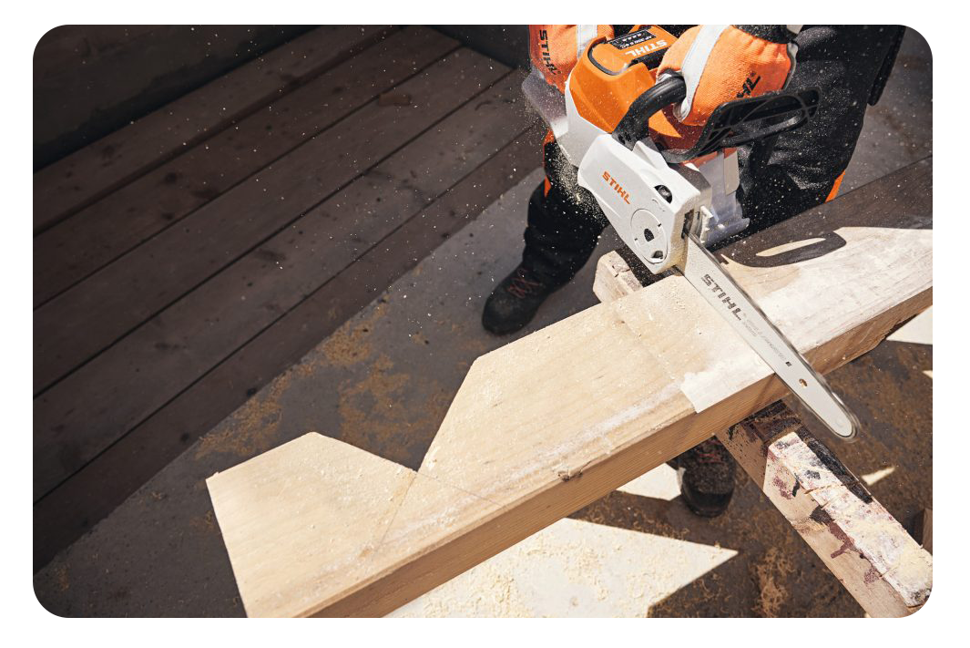 Ergonomiczna dźwignia sterująca i gumowany uchwyt Softgrip zapewniają pewny chwyt i wygodę, a metalowa przypora szponowa ułatwia precyzyjne i bezpieczne cięcia. Uchwyt obsługowy z potencjometrem pozwala płynnie regulować prędkość pilarki, a system bezpiecznego rozruchu z przyciskiem odblokowania i sygnalizacją LED chroni przed przypadkowym uruchomieniem. Bezszczotkowy silnik o kompaktowej konstrukcji gwarantuje wysoką wydajność przy niskim zużyciu energii i długą żywotność, a miękki uchwyt z dźwignią Ergo ułatwia pracę nawet przy mokrych dłoniach, zapewniając stabilną, bezwysiłkową obsługę w każdej pozycji.