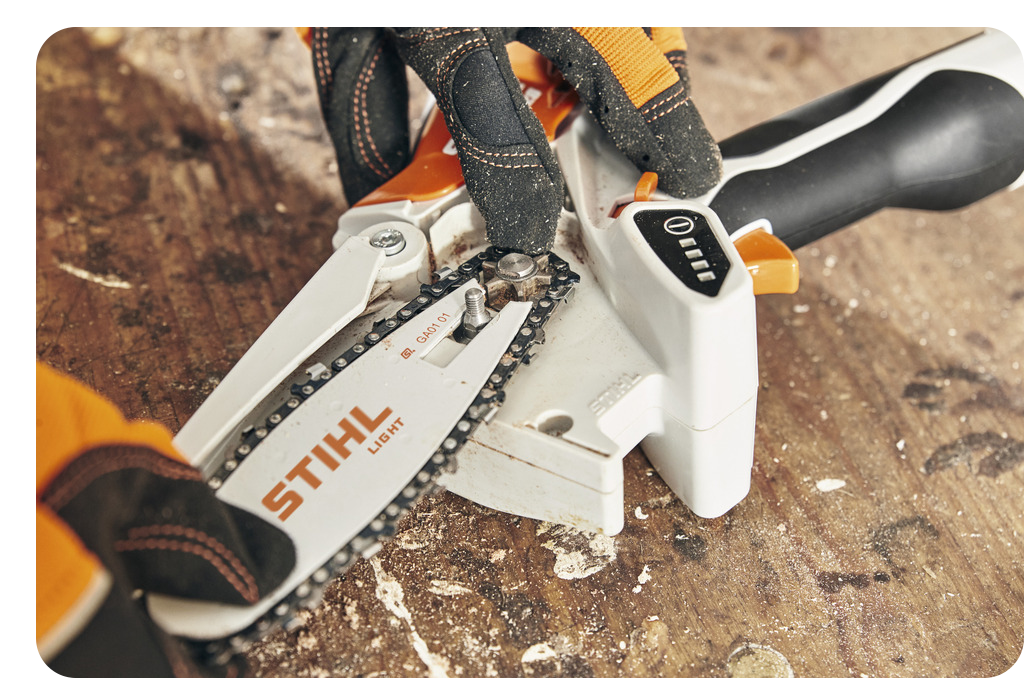 Wskaźnik LED poziomu naładowania pozwala na bieżąco kontrolować czas pracy i odpowiednio zaplanować ładowanie, a ruchoma osłona łańcucha zwiększa bezpieczeństwo, jednocześnie zapewniając dobrą widoczność ciętego materiału. Całość uzupełnia zabezpieczony system rozruchu, który skutecznie zapobiega przypadkowemu uruchomieniu urządzenia podczas przerw, transportu lub serwisu.
